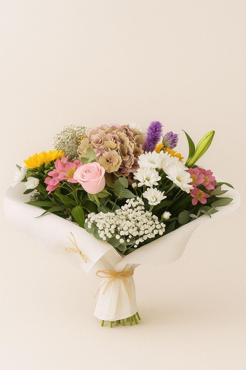 Un amanecer hecho flores. La rosa rosa susurra ternura, el girasol abraza con su luz y la hortensia guarda la calma de los días felices.