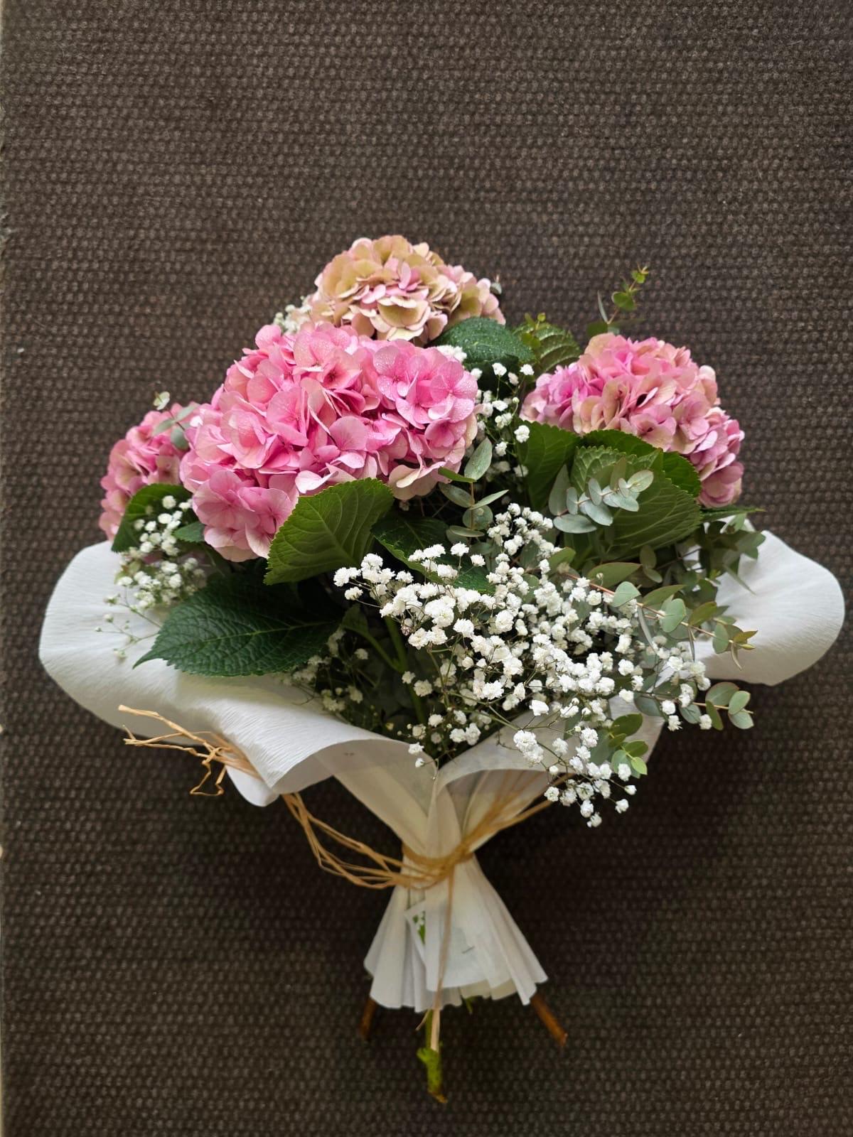 Un ramo que parece hablar el lenguaje de la dulzura. Las hortensias rosadas florecen con una delicadeza que evoca amores tranquilos y promesas suaves.