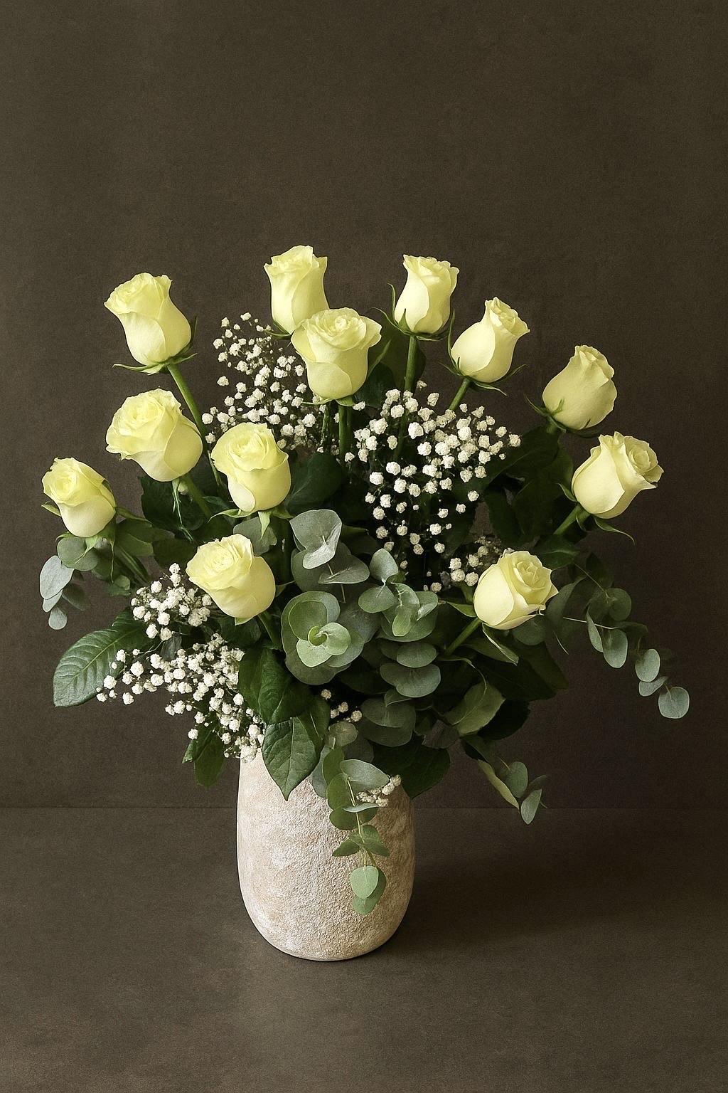Estas rosas de color amanecer iluminan cualquier estancia con su calma y su ternura. Cada tallo de eucalipto y cada nube de gypsophila acompañan el brillo dorado de estas flores, símbolo de afecto puro y gratitud eterna. Una composición que respira equilibrio, serenidad y belleza natural.