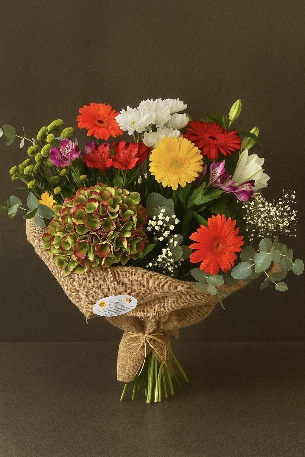 Un estallido de color y energía. Gerberas, crisantemos, alstroemerias y hortensias se combinan en una armonía vibrante que transmite felicidad y vitalidad. Envuelto en yute natural, este ramo celebra la belleza sencilla de la vida y convierte cualquier día en una ocasión especial.