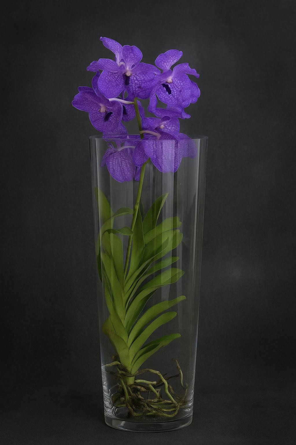 Las Vanda se alzan con majestad etérea, desplegando su violeta profundo como un eco de pureza suspendido en el aire. Sus raíces, libres y luminosas, se entrelazan con el cristal y el agua, revelando la arquitectura secreta de la vida. Cada pétalo refleja una caricia de luz, una pausa en el tiempo donde la naturaleza se convierte en arte.