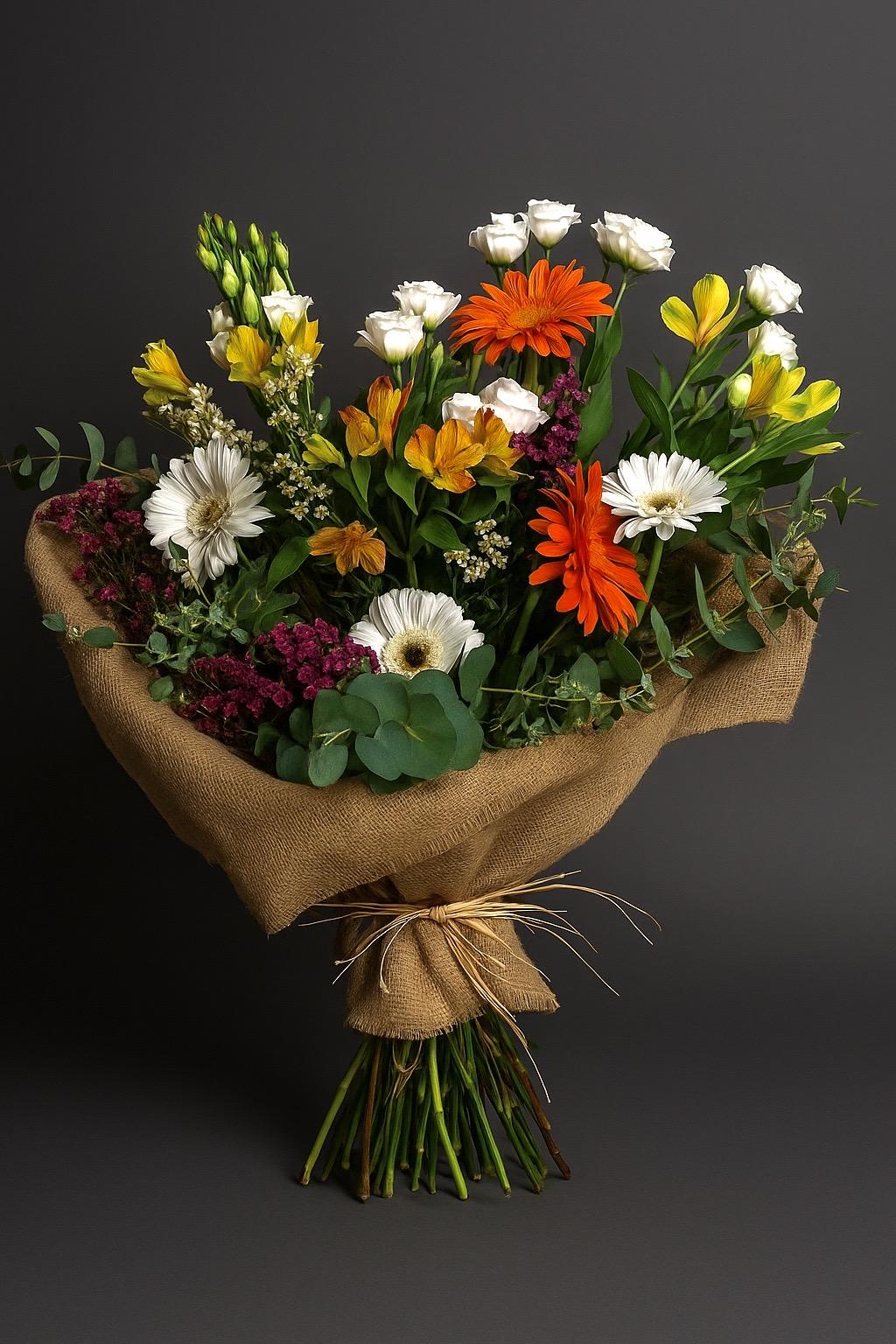 Las gerberas naranjas iluminan la composición como pequeños soles, mientras los lisianthus blancos aportan serenidad y los toques dorados de alstroemerias despiertan la energía de la vida. Entre el verde del eucalipto y el perfume sutil de las flores silvestres, nace una pieza que respira autenticidad, equilibrio y belleza natural.