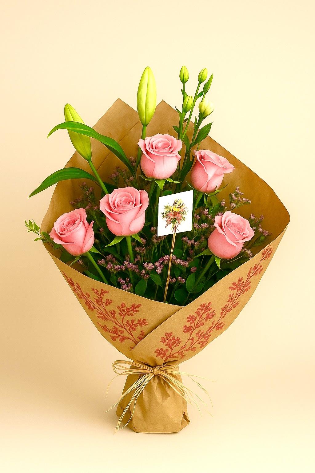 Las rosas rosadas se entrelazan con lirios aún dormidos y toques de statice malva, evocando la calma del amanecer y la promesa de un nuevo día.