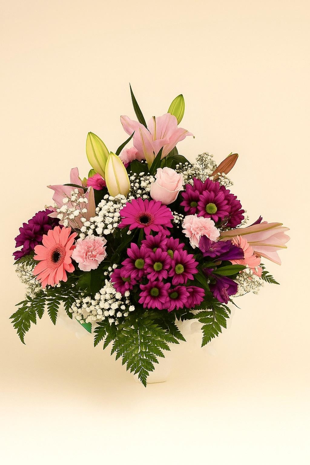 Un estallido de color y vitalidad. El “Centro Brisa Fucsia” mezcla flores en tonos rosados, coral y crema, creando una composición fresca y luminosa. Ideal para transmitir alegría, cariño y energía positiva en cualquier momento del año.