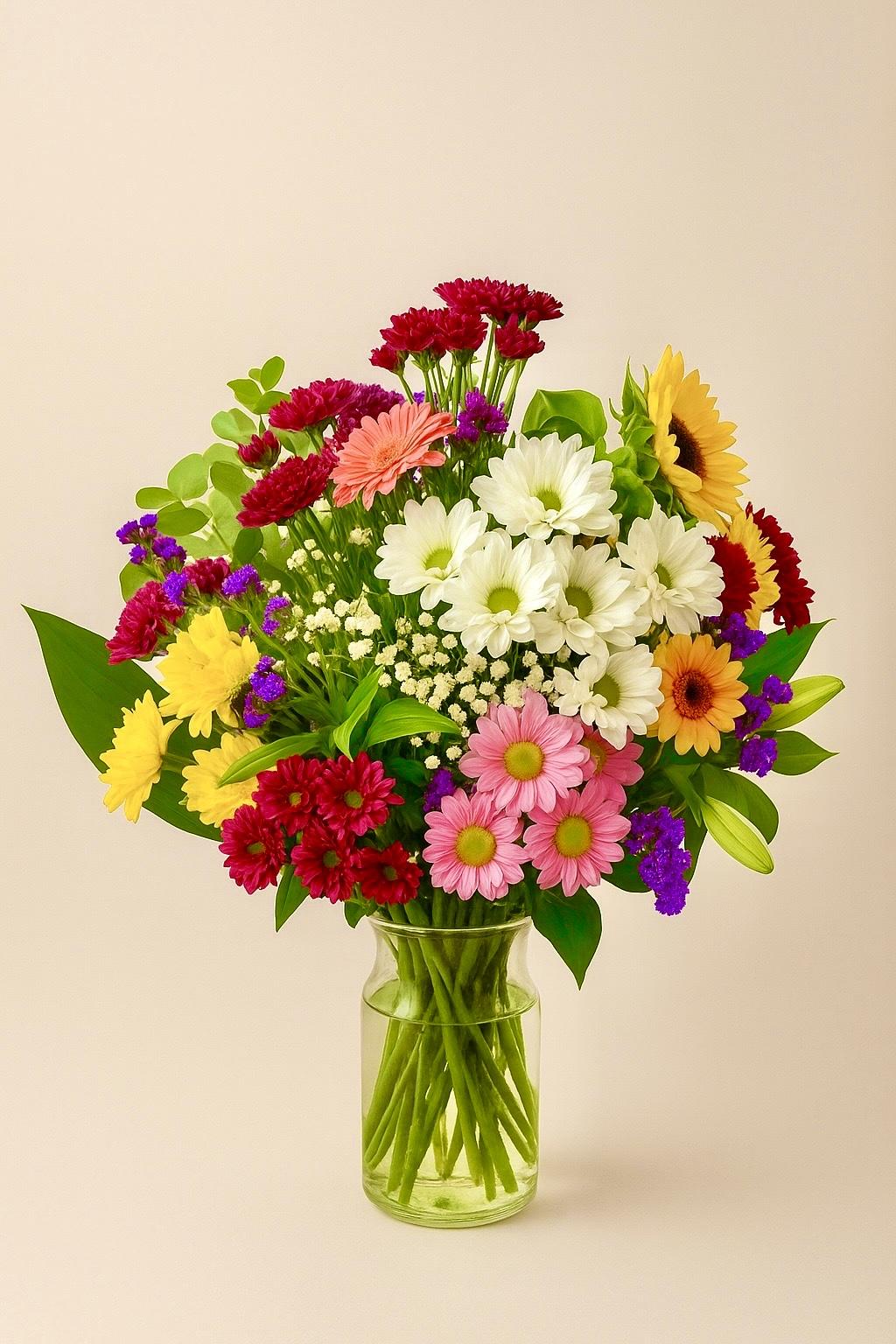 Un canto a la alegría de existir. Girasoles, gerberas y margaritas se funden en una danza de colores que recuerda que cada día es un milagro. “La Vida es Bella” celebra los instantes que nos hacen sonreír, los abrazos que iluminan y los amores que florecen sin pedir permiso. Un ramo que no solo decora, sino que inspira —un recordatorio de que la belleza está en lo sencillo, en lo vivo, en lo real.