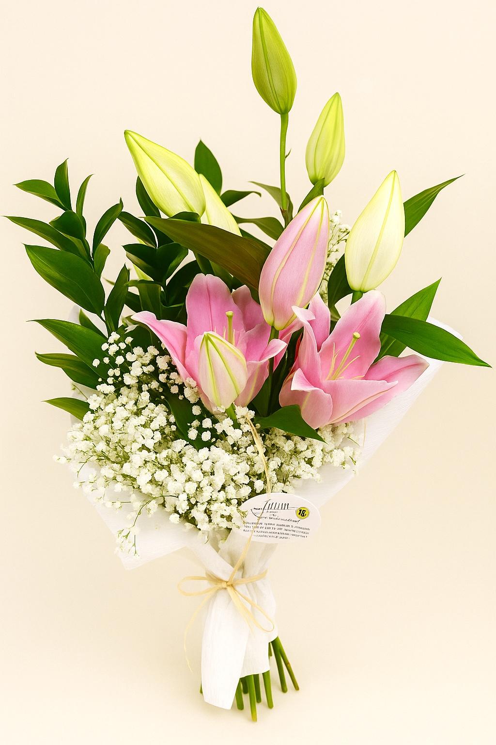 Los pétalos de Lilium rosa flotan entre nubes de paniculata, como hilos de seda en el aire. Su tono suave y su forma elegante envuelven el ambiente en una sensación de dulzura y armonía. Una composición que refleja belleza serena y encanto natural.