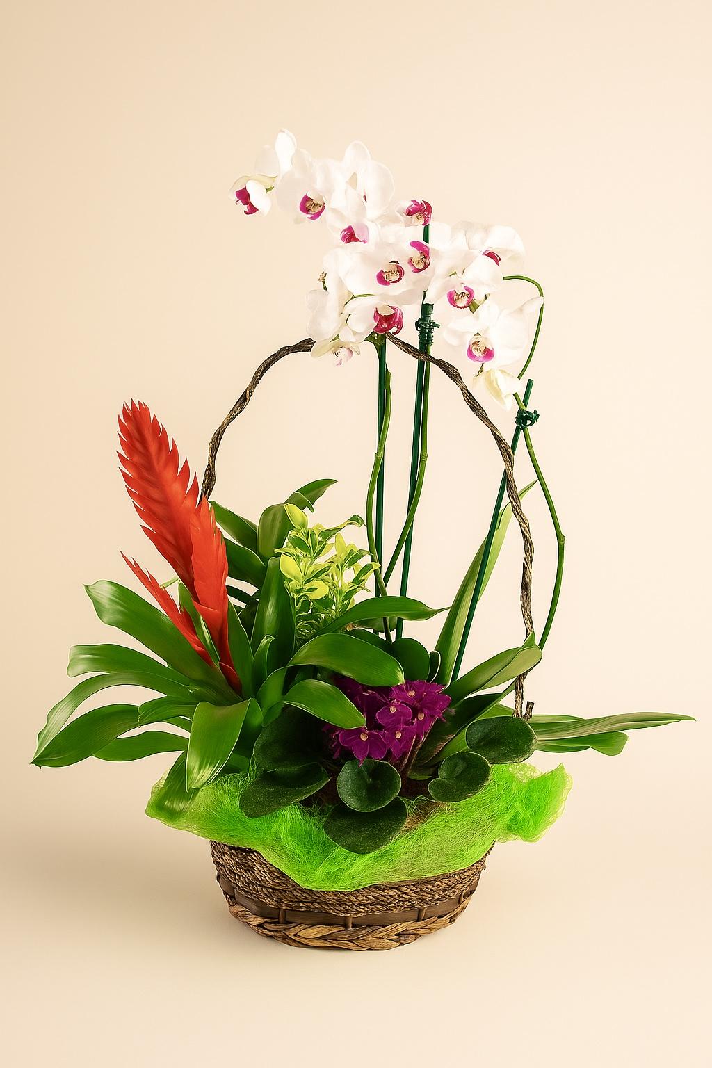 Una composición que celebra la fuerza viva de la naturaleza tropical. Las orquídeas, elegantes y etéreas, se elevan con delicadeza sobre un tapiz de hojas exuberantes y flores encendidas en rojo intenso. Cada forma y color se entrelaza como una sinfonía natural, evocando la frescura de la selva después de la lluvia. Ideal para transmitir vitalidad, elegancia y la energía vibrante de la vida misma.