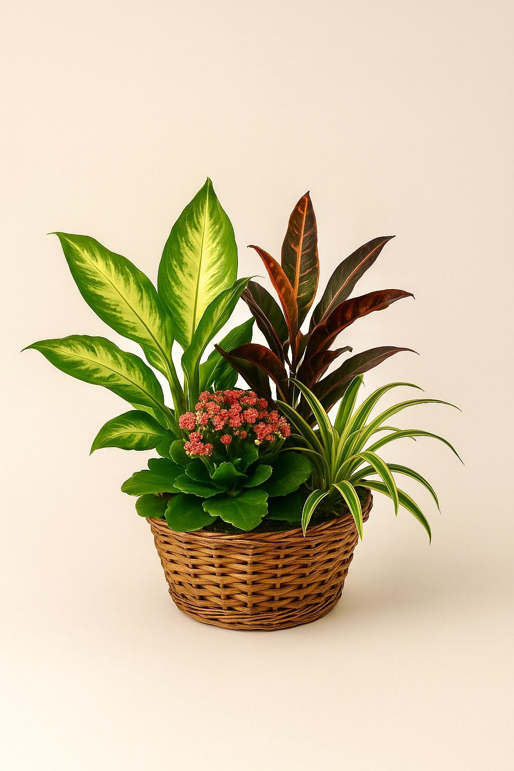 Una cesta que despierta con la serenidad de la mañana y el esplendor de la naturaleza. Jardín del Alba entrelaza verdes profundos y dorados con delicadas flores rosadas que emergen como pequeñas luces al amanecer. Su equilibrio entre hojas brillantes y tonos suaves transmite calma, frescura y armonía, convirtiéndola en una pieza ideal para llenar cualquier espacio de vida y elegancia natural.